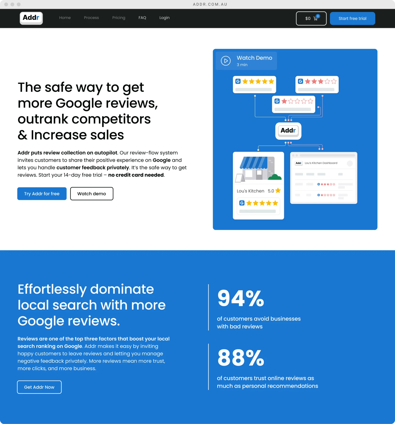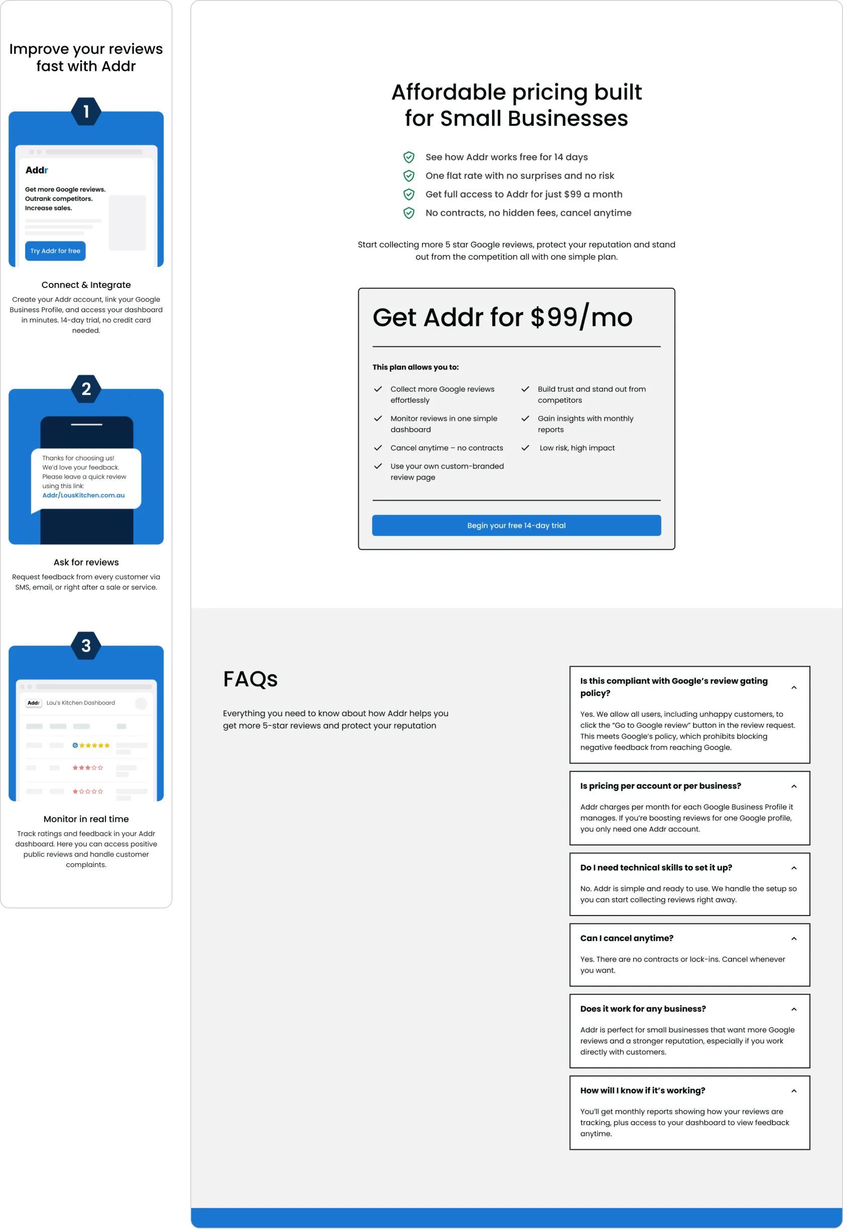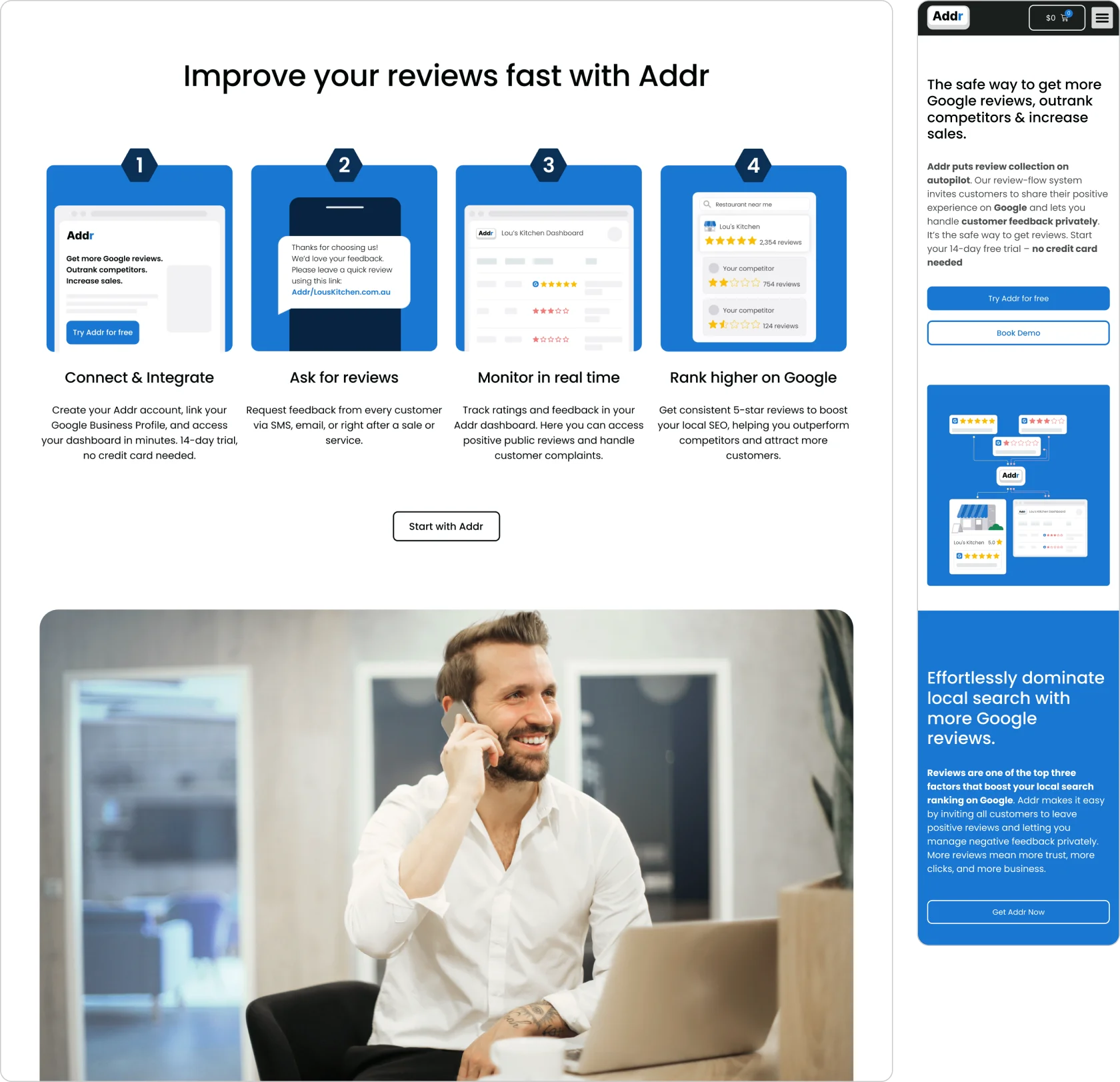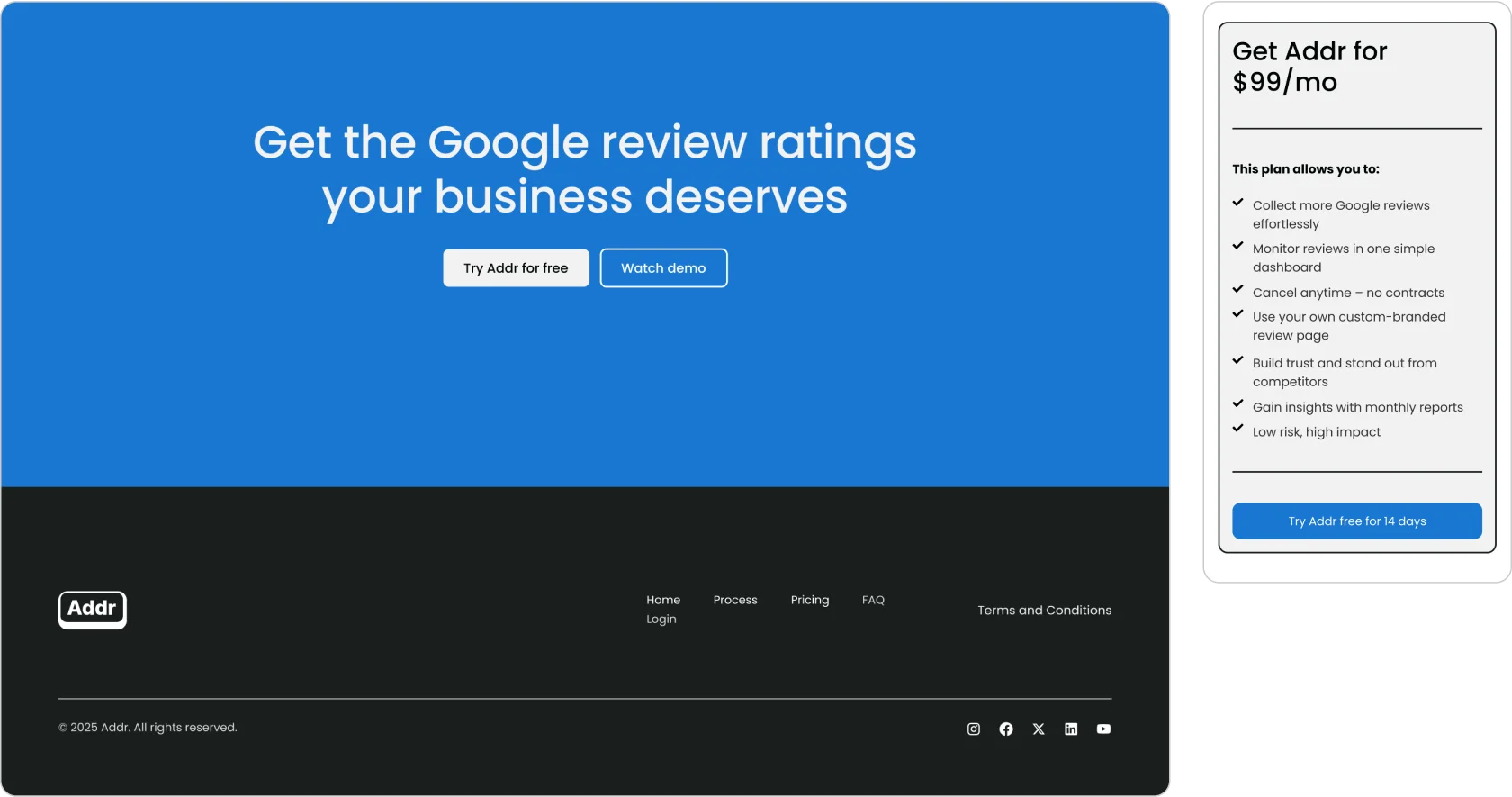 We decided to cut the business cards completely and bring full attention back to Addr itself. That clarity changed the narrative: visitors and testers now immediately understood that Addr was software to help them manage and grow reviews.
