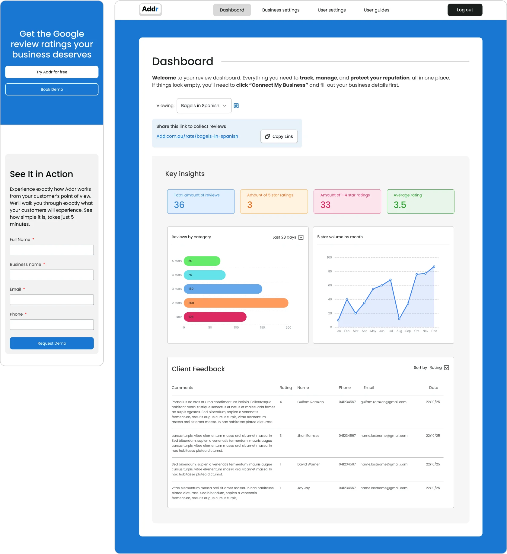 Addr is a SaaS platform built to help businesses improve their online reputation by collecting and managing customer reviews. The functionality was ready, but the product lacked clear UX and a professional digital presence. The goal was to launch quickly with a strong brand, intuitive user flows, and a website that could attract early paying customers.